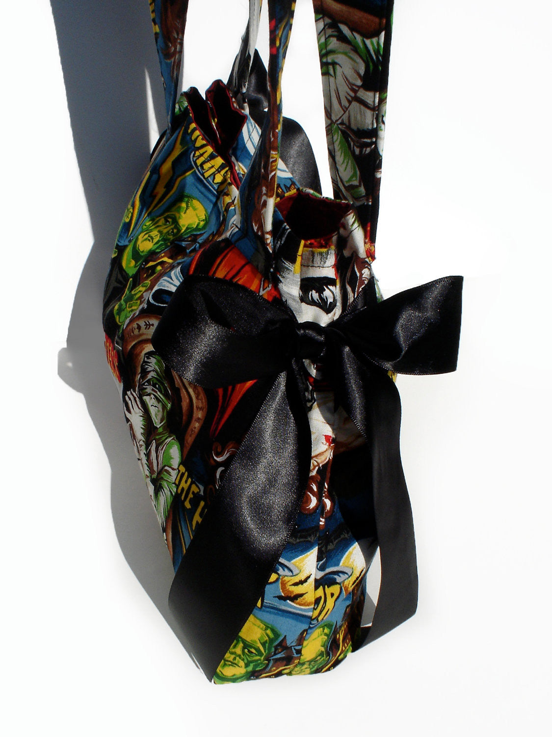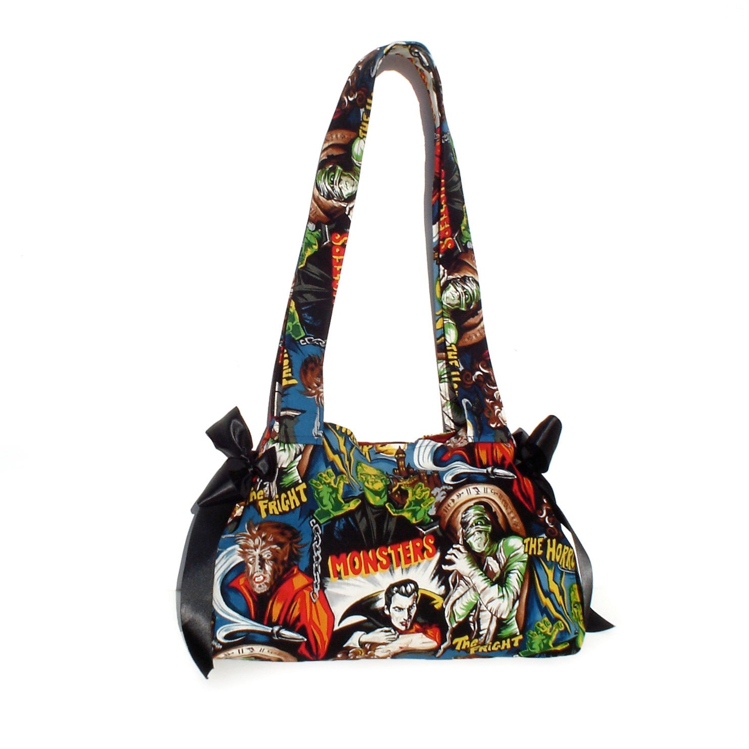 This spooky purse is made from a rare Hollywood movie monsters theme fabric. Dracula, Wolfman, the mummy, and Frankenstein cover this great novelty item!